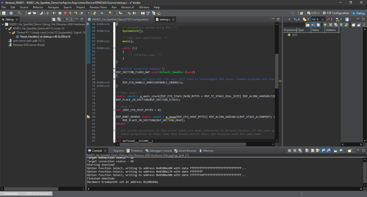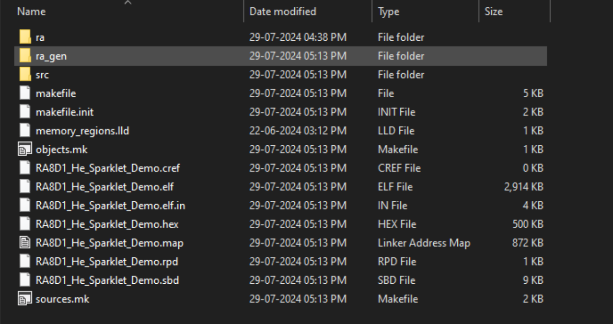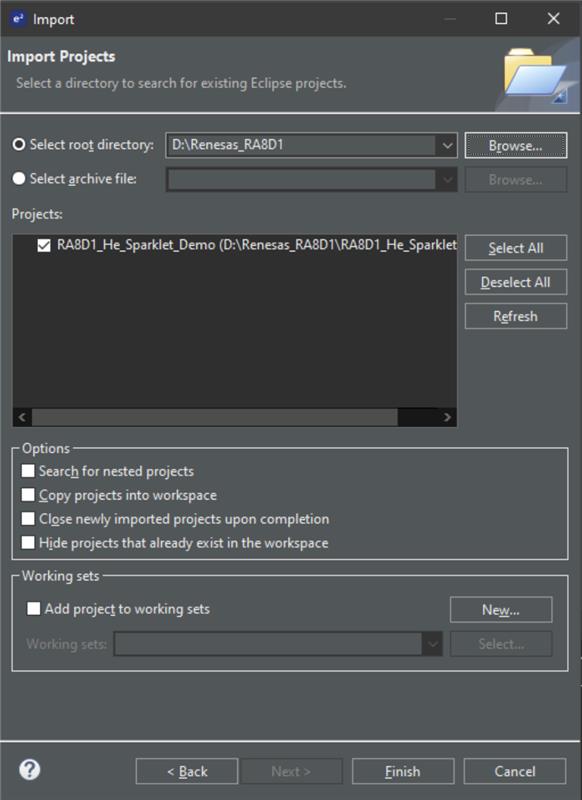 Uncompress the example project, RA8D1_He_Sparklet_Demo.zip in this case, on to your working directory. (e.g. D:Renesas_RA8D1RA8D1_He_Sparklet_Demo).
